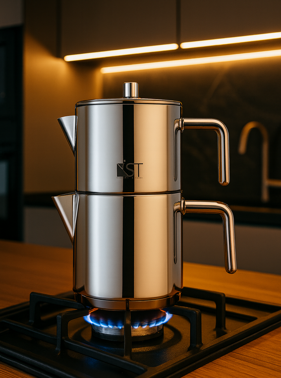 کتری و قوری طرح ترک مدل 2022 از برند KST، با طراحی دو طبقه و بدنهای از استیل ضد زنگ، مناسب برای دمکردن چای به سبک ترکی و ایرانی است. فرم ساده، دستههای استیل مقاوم و حجم مناسب، این محصول را به انتخابی کاربردی و زیبا برای هر خانه تبدیل کرده است.